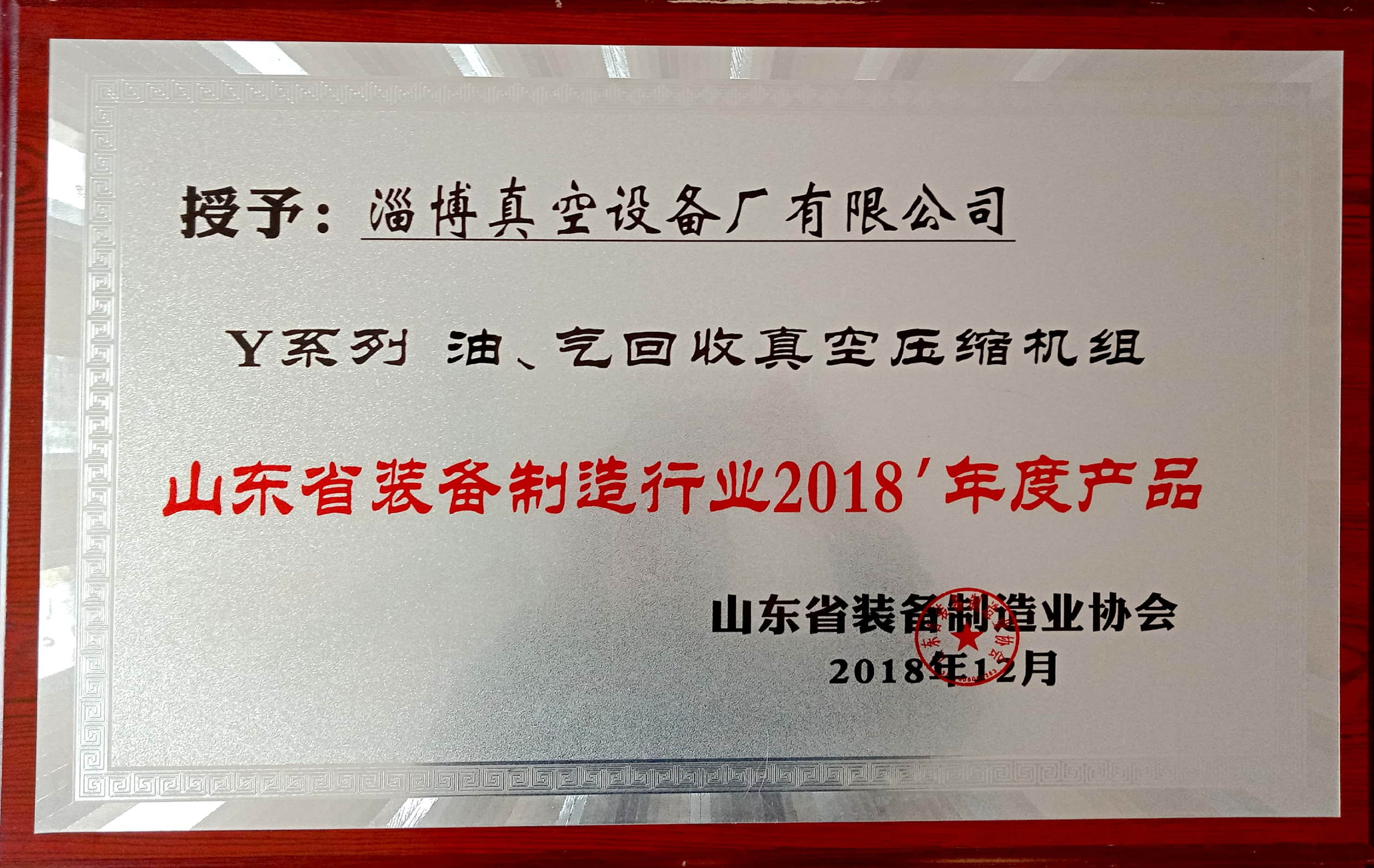淄博真空設(shè)備廠有限公司被授予“山東省裝備制造行業(yè)優(yōu)秀企業(yè)”、“優(yōu)秀會員企業(yè)”,公司董事長黃毅同志被授予“山東省裝備制造業(yè)優(yōu)秀企業(yè)家”; 公司產(chǎn)品Y系列油、氣回收真空壓縮機(jī)組獲2018山東省裝備制造行業(yè)年度產(chǎn)品。
